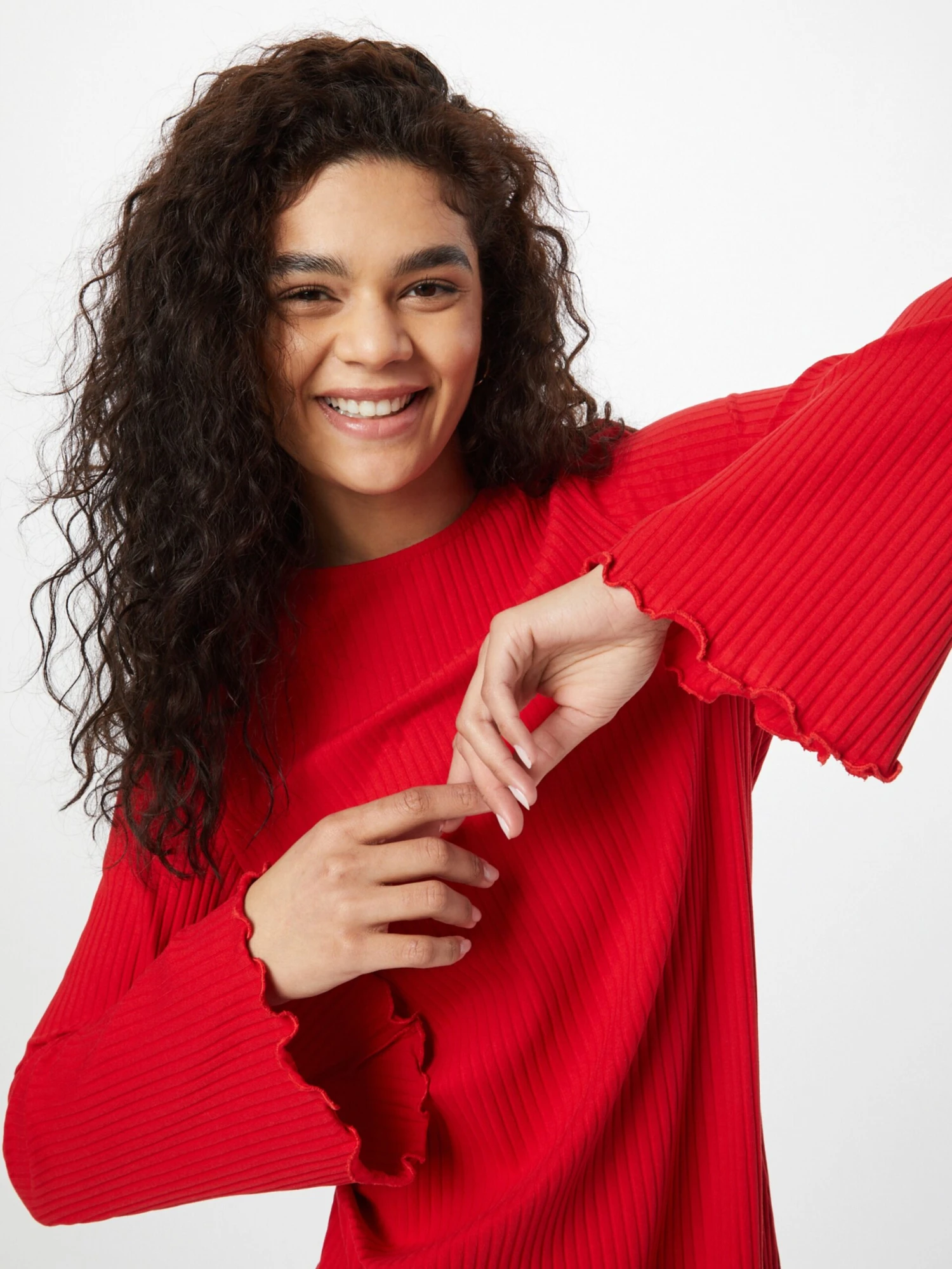 EffenJerseyRonde halsGeribbeld gebreidGerolde boordTrompetmouwenOp staal nadenVoelt zacht aan